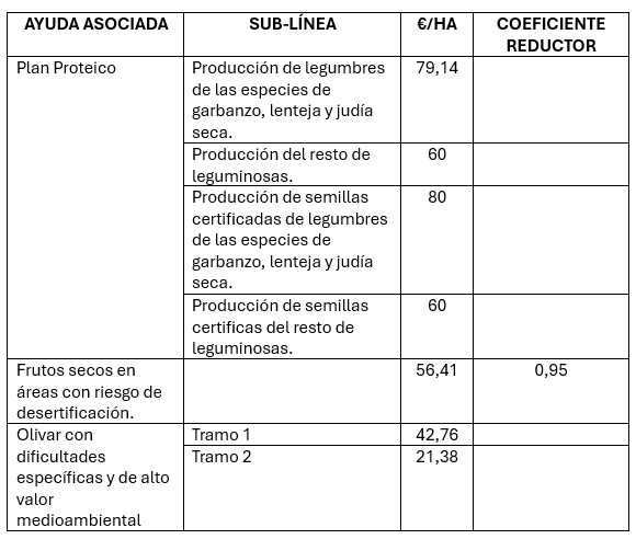 En esta campaña, debido al aumento de la superficie solicitada de la ayuda asociada a los productores de frutos secos en áreas con riesgo de desertificación, se establece un coeficiente reductor de superficie en la línea peninsular, con el fin de garantizar el importe unitario mínimo.